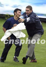 一名在昆明觀看西班牙皇家馬德里足球隊(duì)二十六日下午在的訓(xùn)練的狂熱球迷跳入場中,口中呼喊著勞爾的名字,希望得到簽名,被及時(shí)趕來的工作人員阻止。中新社記者:毛建軍