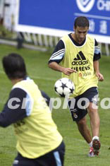 西班牙皇家馬德里足球隊(duì)二十六日下午在昆明冒雨訓(xùn)練,圖為勞爾在對抗訓(xùn)練中帶球過人。中新社記者:毛建軍