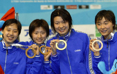 27日,中國游泳隊(duì)在巴塞羅那世界游泳錦標(biāo)賽,奪得了女子四乘一百米混合泳接力賽的冠軍,中國姑娘還以三分五十九秒八九的成績打破了世錦賽的賽會紀(jì)錄,并且如愿拿到了這枚份量最重的金牌。(圖左起)戰(zhàn)殊、羅雪娟、周雅菲和楊雨登上領(lǐng)獎臺。