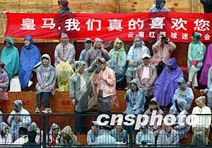 各地球迷二十七日在昆明冒雨觀看皇家馬德里足球隊(duì)巨星們的訓(xùn)練,激情依然不減。中新社記者:毛建軍