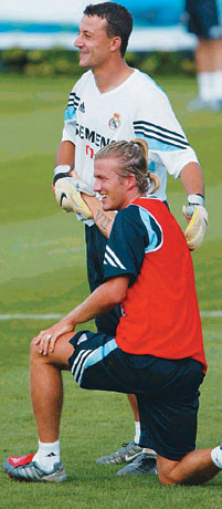 在隨后11打11的大對抗中,小貝仍然被分在替補一組,表現(xiàn)平平。在后衛(wèi)的緊逼之下,小貝在曼聯(lián)時那種姿態(tài)優(yōu)雅的傳中根本看不到。而在一次回防時,小貝竟將齊達內的傳球鏟進了自家大門。這個烏龍球也成了小貝在昨天訓練中唯一的收獲。