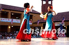 北加州華人運動會好時威之夜頒獎晚會七月二十六日晚在美國圣荷西市舉行,生活在美西灣區(qū)的華裔演藝人士為頒獎晚會獻上了精彩的演出。圖為中華演藝學院的學員表演蒙族舞《情思》。作者:陳鋼
