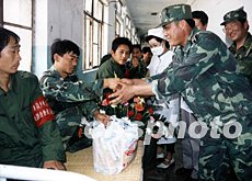 安徽省淮南軍分區(qū)指揮員來到醫(yī)院,向七月淮河抗洪中傷病住院的民兵贈送鮮花和慰問品。今夏三次洪峰過后,洪水已于七下旬日漸回落。作者:詹濤