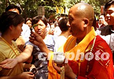 慶典儀式于上午十時(shí)在潭柘寺大雄寶殿外小廣場(chǎng)舉行。大雄寶殿上方“潭柘寺建寺一千六百九十六年暨祈禱世界和平國(guó)泰民安法會(huì)”紅色橫幅十分醒目。北京佛教協(xié)會(huì)、北京市文物局、北京市旅游局負(fù)責(zé)人以及數(shù)百名中外游客參加了慶典儀式。隨后,潭柘寺方丈常道法師在大雄寶殿內(nèi)主持法會(huì)。二十多位住寺僧侶及眾多善男信女在缽和木魚(yú)等敲打樂(lè)的伴奏下吟唱佛經(jīng)。常道法師向佛像敬香、頂禮膜拜,祈禱世界和平國(guó)泰民安。