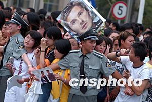 從八月一日凌晨開(kāi)始,眾多北京球迷聚集在皇家馬德里足球隊(duì)下榻的北京飯店門(mén)前,高聲呼喊戴維、勞爾等人的名字,渴望一睹巨星風(fēng)采。大批保安人員和警察在門(mén)口維持秩序。中新社記者:張煒 毛建軍