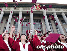 北京中加學校2003畢業(yè)典禮八月二日在北京人民大會堂舉行,三百一十一名高中學生及三十六名BTM、IHM專業(yè)的學生畢業(yè),高中畢業(yè)學生報考外國大學的升學率達到百分之百。圖為畢業(yè)的學生們在人民大會堂外歡呼慶祝。中新社記者:毛建軍