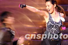 日前,在香港舉行的2003年度香港小姐競選準決賽上,進入十二名佳麗行列的王從希,在準決賽現(xiàn)場表演精彩的“少女武功”。中新社記者:錢興強