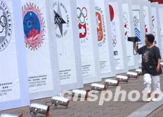 北京2008年奧運(yùn)會(huì)徽八月三日夜大白天下后,引發(fā)中國民眾的關(guān)注。一名市民用攝像機(jī)拍攝下歷屆奧運(yùn)會(huì)會(huì)徽的宣傳畫。中新社記者:賈國榮
