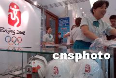今天在各商場和首都機場出售的紀(jì)念品包括三種T恤衫、兩種帽子、黑白兩色鑰匙鏈和普通紀(jì)念章,價格從十五元到一百六十八元不等。貴重金屬紀(jì)念章則由中國金幣總公司在指定的三家金幣公司系統(tǒng)銷售,總共一萬兩千枚的金章單枚售價五百元,一百九十元一枚的銀章共有兩萬枚。會徽紀(jì)念郵品在中國集郵總公司北京營業(yè)部和北京市郵票公司發(fā)售。據(jù)北京營業(yè)部的銷售人員透露,僅上午半天時間,零售的紀(jì)念郵折和紀(jì)念封已經(jīng)售罄。