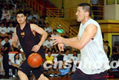 NBA超級(jí)巨星姚明和巴特爾,8月5日在香港修頓球場(chǎng)展開(kāi)訓(xùn)練,備戰(zhàn)6日晚的澳洲勁旅墨爾本老虎隊(duì)。