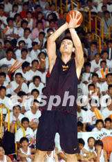 NBA超級(jí)巨星姚明,8月5日在香港修頓球場(chǎng)為香港青年籃球愛(ài)好者表演精湛投籃球技。