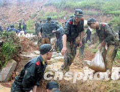 受熱帶風(fēng)暴“莫拉克”影響,8月5日凌晨6時(shí)許,福建晉江市磁灶鎮(zhèn)東山水庫(kù)一外圍堤壩出現(xiàn)20米長(zhǎng)的決口,由于水庫(kù)與下游農(nóng)田有約20米的落差,下游的3個(gè)村莊、1萬(wàn)多人口、1000余畝農(nóng)田因此受到嚴(yán)重威脅。二千多軍民經(jīng)過(guò)5個(gè)多小時(shí)的搶險(xiǎn)奮戰(zhàn),終于堵住決口。作者:徐承彬