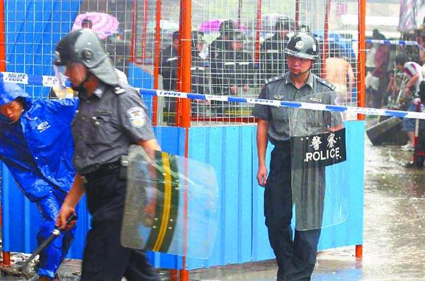 據(jù)武副場長介紹,8月5日下午3時(shí)15分左右,黃沙市場有關(guān)人員得知此事后,派出保安將紅線界上的店鋪移走。昨天上午8時(shí)左右,市水產(chǎn)供銷公司一方60多名身穿迷彩服的男子手持木棍、鋼管等物來到黃沙市場內(nèi)。市場內(nèi)的保安得知后就迅速向上級(jí)報(bào)告,并及時(shí)向荔灣區(qū)多寶路派出所報(bào)警。當(dāng)派出所警察趕至現(xiàn)場時(shí),勸說對(duì)方放下木棒及鋼管時(shí),遭到對(duì)方拒絕。警察又迅速向110求援,隨后就有10多名防暴警察趕至現(xiàn)場,用盾牌將雙方人員隔開。