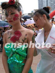 七日,在廣州上下九商業(yè)步行街廣場(chǎng)上,一場(chǎng)精彩的人體彩繪吸引眾多市民駐足觀看。在廣州,人體彩繪已成為商業(yè)推廣中的一項(xiàng)主要活動(dòng)。作者:劉衛(wèi)勇