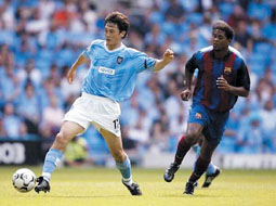 這是曼城備戰(zhàn)新賽季英超的最后一場比賽,同時也是曼徹斯特大球場的揭幕戰(zhàn),因此,主教練基岡格外重視。孫繼海首發(fā)出場擔任右后衛(wèi),他的身后是門將西曼。而他面對的是剛剛轉(zhuǎn)會巴塞羅那隊的小羅納爾多的進攻。第5分鐘,奧維馬斯帶球突破菲利普斯后獲得很好的機會,孫繼海上前封堵,逼得奧維馬斯傳球出界。雖然對手實力很強,但在主場作戰(zhàn)的曼城仍與對手展開對攻。孫繼海與菲利普斯這邊的進攻明顯要比左路活躍。第34分鐘曼城首先打破僵局,貝爾科維奇中路得球后轉(zhuǎn)身快速突破,雷茨格爾慌亂中將球誤傳給阿內(nèi)爾卡,法國人門前右腳推射破門。上半場曼城一球領(lǐng)先巴塞羅那。