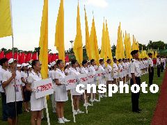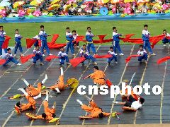 2003年8月10日下午5時(shí),以《青春放飛新世紀(jì)》為主題的廣東省第六屆大學(xué)生運(yùn)動(dòng)會(huì)開幕式在湛江師范學(xué)院體育場(chǎng)進(jìn)行第二次預(yù)演,規(guī)?涨,精彩紛呈。熱烈、奔放、高昂、大氣的格調(diào)令人耳目一新。李滿青 攝