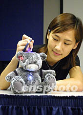 香港科技大學(xué)物理學(xué)系學(xué)生,8月14日示范安裝紫外線感應(yīng)器的熊寶寶玩具,該產(chǎn)品以不同顏色的燈(綠、白、藍(lán)、紅)顯示紫外線的強(qiáng)度發(fā)出警號(hào)。蕭紓昊 攝