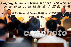 法國(guó)雅高亞太區(qū)董事行政總經(jīng)理艾森柏(右)十五日在北京宣布,包括中國(guó)首家國(guó)際經(jīng)濟(jì)性酒店天津宜必思在內(nèi)的九家酒店即將在中國(guó)開業(yè)。他表示“非典”并沒有降低中國(guó)未來發(fā)展?jié)摿Γ@是拓展中國(guó)酒店網(wǎng)絡(luò)最有利的時(shí)刻。中新社記者:鄭萍萍