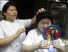 8月16日清晨,中國最后康復(fù)出院的SARS患者盧志艷在北京地壇醫(yī)院ICU病房護士長劉小冬幫助下精心梳妝準備參加出院慶典儀式。盧志艷是北京小莊醫(yī)院藥劑師,4月25日感染SARS住院治療時間長達112天。中新社記者:任晨鳴