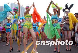 八月十七日下午,第十三屆青島國際啤酒節(jié)舉行盛大的狂歡巡游活動,由六十名女模特組成的“泳裝彩繪方隊”成為本次巡游活動的最亮點(diǎn)。中新社記者:張煒