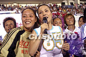 直到比賽開(kāi)始后5分鐘,先農(nóng)壇體育場(chǎng)外仍有大量等著要票的球迷,這一切源于人們對(duì)女足的關(guān)愛(ài)。開(kāi)球前,載著38位南北女俠的38輛摩托車緩緩駛?cè)肭驁?chǎng),在與著名歌星田震共同高歌《風(fēng)雨彩虹·鏗鏘玫瑰》這首女足之歌后,隊(duì)員們手捧著鮮花擁向前來(lái)為她們助威的“抗非典”女英雄們。女足姑娘們的精彩表演給了現(xiàn)場(chǎng)球迷至高享受,同時(shí)也為她們自己贏來(lái)了巨額的獎(jiǎng)金,獲勝的北方隊(duì)得獎(jiǎng)10萬(wàn)元,而南方隊(duì)也有5萬(wàn)元之多的安慰。兩隊(duì)的進(jìn)球功臣白潔、韓端因?yàn)閮?yōu)異的表現(xiàn)開(kāi)走了兩輛獎(jiǎng)品摩托車。