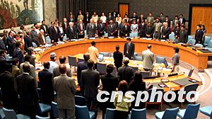 聯(lián)合國(guó)安理會(huì)二十日晚間舉行緊急會(huì)議研究有關(guān)聯(lián)合國(guó)設(shè)施的安全保障問(wèn)題,與會(huì)的安理會(huì)成員國(guó)代表在會(huì)議中起立默哀,悼念十九日發(fā)生在巴格達(dá)的炸彈襲擊事件中的遇難者。中新社記者:趙海燕