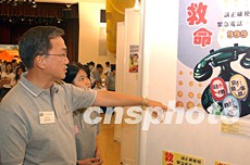 曾蔭培參觀“正確使用999緊急電話”海報設(shè)計獲獎作品。中新社記者:錢興強