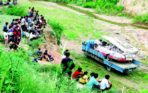 在現(xiàn)場看到,發(fā)生車禍地點(diǎn)是個(gè)轉(zhuǎn)彎處,道路旁有個(gè)陡坡,陡坡下是一個(gè)約10米高的懸崖。據(jù)知情者稱,這輛從吳旗到延安的客車駛到這里,與兩輛油罐車相會(huì)時(shí)突然墜入懸崖下的一條小河里,整個(gè)翻了過來。搶救者后來用鋼管等工具把客車翻過來,才將旅客救出,但已有21人當(dāng)場死亡,傷者立即被送往延安大學(xué)附屬醫(yī)院進(jìn)行搶救。