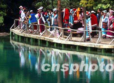 四川省馳名中外的九寨溝風景旅游地,今年春天在抗擊SARS病毒的大戰(zhàn)中雖然游客銳減,但成功拒病毒于千里之外。如今八月之夏,九寨溝的青山綠水邊又成為千上萬中外游客的最佳選擇。中新社記者:賈國榮