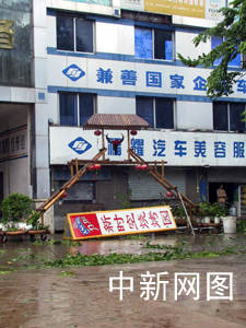 受其影響,海南省會?谑惺袇^(qū)出現(xiàn)一年來最大風災,一家燒烤園的招牌倒了。