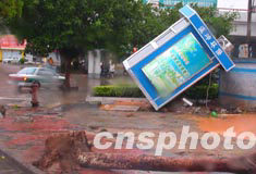 八月二十五日清晨,“科羅旺”臺(tái)風(fēng)襲擊海南省海口市。?谑薪值辣姸酂粝涫綇V告牌被吹到在地。作者:蔣聚榮