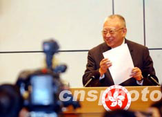 香港特首董建華8月28日在出席深港西部通道的奠基典禮后,在香港政府總部召開記者會,轉達國務院副總理曾培炎對港粵經驗合作的重視和對香港經濟的支持。作者:洪少葵