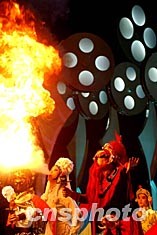 今秋在北京北展劇場舉行的中國電影華表獎(jiǎng)?lì)C獎(jiǎng)晚會(huì)上,京劇名家現(xiàn)場表演噴火絕活,為晚會(huì)助興。中新社記者:武仲林