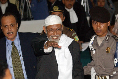 印尼一家法庭9月2日裁定被疑與“基地”組織有牽連的東南亞激進(jìn)組織“伊斯蘭祈禱團(tuán)”的精神領(lǐng)袖阿布·巴卡爾·巴希爾(中)參與了叛國行動,并判處他4年監(jiān)禁。巴希爾不服這個(gè)判決結(jié)果,表示將上訴。