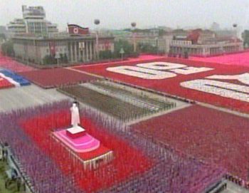 隨后,平壤市各界幾十萬名群眾簇擁著領袖雕像、彩車、標語牌走過主席臺前。