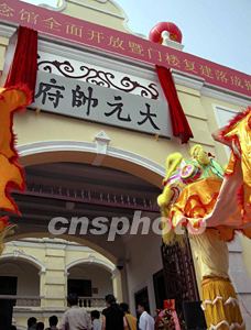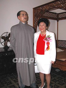 孫中山大元帥府紀(jì)念館全面開放暨門樓修建落成典禮儀式,十日在廣州孫中山大元帥府舊址舉行,孫中山的孫女孫穗芳專程回穗?yún)⒓釉擁椈顒樱⒃陴^內(nèi)與祖父的塑像合影留念。作者:劉衛(wèi)勇