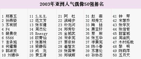 據(jù)聯(lián)合早報報道,“2003年亞洲人氣偶像50強”投選范圍包括從事演藝、歌唱、體育、模特兒及服裝界的亞洲人士。經過5周熱烈的投票,吸引將近7萬張選票。