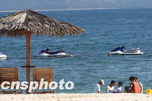 九月十一日,參加2003年新絲路中國(guó)模特大賽的眾多佳麗在大賽組委會(huì)的安排下,集體到海南三亞風(fēng)景秀麗的吾之洲海灘上參加海上時(shí)尚運(yùn)動(dòng)。圖為模特馬樂(lè)在海灘邊展示優(yōu)美身姿。中新社記者:盛佳鵬