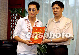 九月十三日,香港演藝界影視紅星吳啟華先生接受由廣州電視臺(tái)副臺(tái)長(zhǎng)頒發(fā)的第十一屆“美在花城”準(zhǔn)決賽評(píng)委聘書(shū)。作者:劉衛(wèi)勇