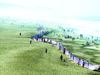 同樣的旗;顒釉谌ツ暧谂f金山市金門大橋海旁舉行過,不過主題略有不同。