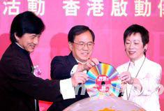 香港旅游發(fā)展局9月15日推出全新的「香港-樂在此,愛在此!」全球廣告宣傳活動,政務(wù)司長曾蔭權(quán)[中]、旅游發(fā)展局主席周梁淑怡[右]及香港旅游大使成龍出席主持啟動儀式。作者:洪少葵
