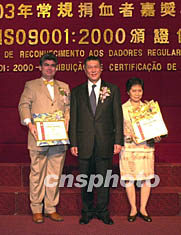 今日還同時(shí)舉行了澳門捐血中心獲得ISO九00一:二000質(zhì)量認(rèn)證頒證儀式,國(guó)家認(rèn)證認(rèn)可監(jiān)督管理委員會(huì)主任王鳳清專程前來頒發(fā)證書并致辭祝賀。