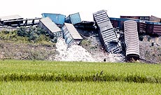 記者看到,脫軌的車廂共有19節(jié)。有兩節(jié)車廂完全橫在了鐵路中央,另幾節(jié)側(cè)翻在鐵路一側(cè),還有兩節(jié)沖下了鐵路路基,多處鐵軌呈彎曲狀,許多車廂的車輪已經(jīng)飛落到周圍的稻田里,路邊的幾根電線桿被連根拔起。列車上集裝箱內(nèi)的瓷磚、大理石等散落一地。據(jù)有關(guān)部門認(rèn)定,脫軌車廂位于列車第27至45節(jié)。南昌鐵路局目前已組織人員在現(xiàn)場進(jìn)行緊急救援。