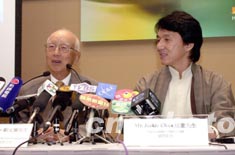 香港貿(mào)易發(fā)展局9月18日在香港舉行《香港國(guó)際影視展2003》記者會(huì),嘉禾娛樂(lè)事業(yè)主席兼貿(mào)發(fā)局影視娛樂(lè)業(yè)咨詢委員會(huì)主席鄒文懷(左)、「香港電影大使」成龍分別于會(huì)上發(fā)言。作者:鄧慶樂(lè)