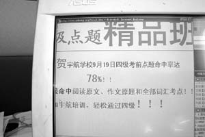 據(jù)《京華時報》報道,北京某高校剛剛參加完英語四級考試的小鮑反映,前天,不少同學(xué)在地質(zhì)大學(xué)看到當(dāng)晚在該校將舉行“四級考試考前點題培訓(xùn)”的海報,入場券50元,舉辦方為北京宇航考試培訓(xùn)學(xué)校!斑@次培訓(xùn)點中了試題中大概50分的內(nèi)容!”