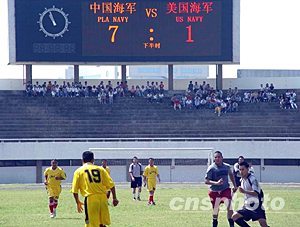 正在廣東湛江訪問的美艦官兵與中國海軍南海艦隊的官兵二十五日上午在湛江市體育中心舉行了一場別開生面的足球友誼賽,最后,中國海軍隊以七比一的大比分獲勝。作者:李小軍