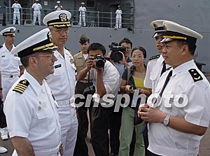 美國(guó)艦艇編隊(duì)于九月二十六日上午結(jié)束對(duì)中國(guó)南海艦隊(duì)的訪問(wèn)離開(kāi)湛江港。圖為中國(guó)南海艦隊(duì)參謀長(zhǎng)侯月喜少將與美艦艦長(zhǎng)話別。作者:李小軍