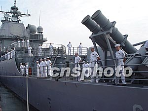 美國(guó)艦艇編隊(duì)于九月二十六日上午結(jié)束對(duì)中國(guó)南海艦隊(duì)的訪問(wèn)離開(kāi)湛江港。圖為美國(guó)導(dǎo)彈巡洋艦“考彭斯”號(hào)上的美軍在甲板上。作者:李小軍