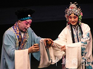 小青為白娘子和許仙(于魁智飾)當(dāng)紅娘。中新社記者 劉雨生 攝