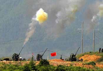 突然,煙霧彈、錫箔干擾彈等在上空散開,此時,民兵預(yù)備役官兵們早已分布在不同位置,實(shí)施對空射擊。隨著震耳欲聾的“轟隆”聲,一團(tuán)團(tuán)煙霧驟然從地面騰空而起,糧庫、公路、油庫及居民房成了一片火海,整個演練場上硝煙彌漫。